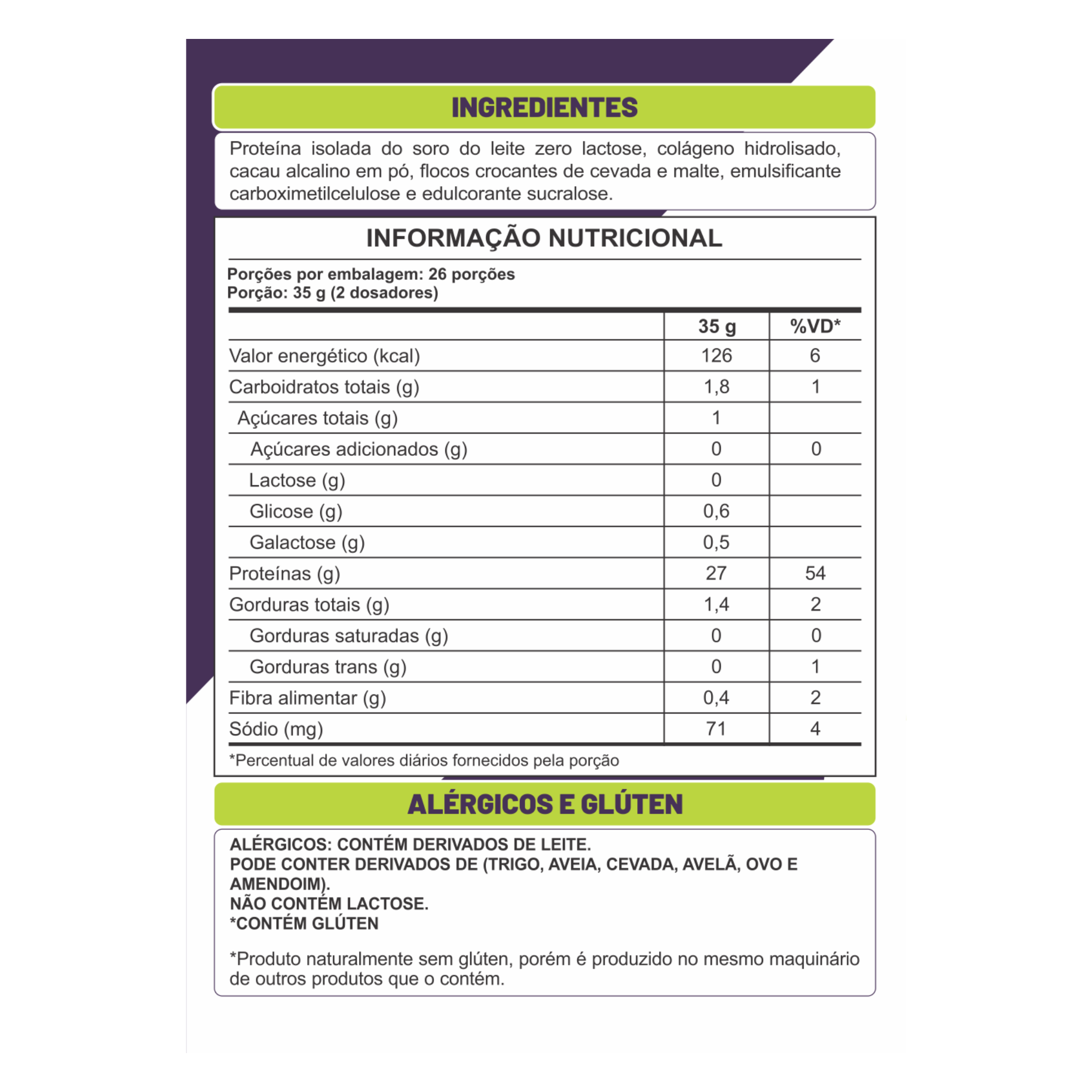Proteína isolada do soro do leite zero lactose, colágeno hidrolisado, cacau alcalino em pó, flocos crocantes de cevada e malte, emulsificante carboximetilcelulose e edulcorante sucralose.