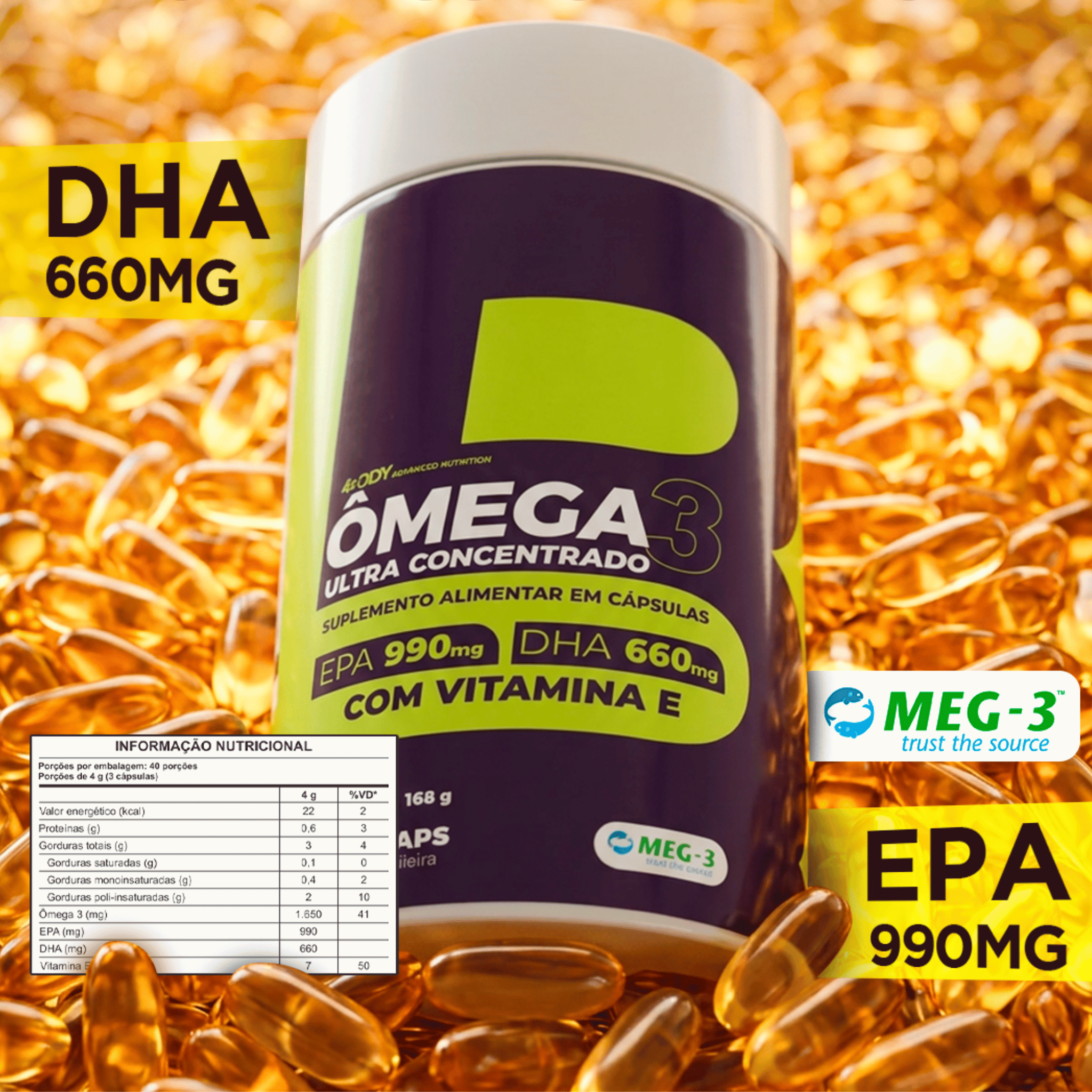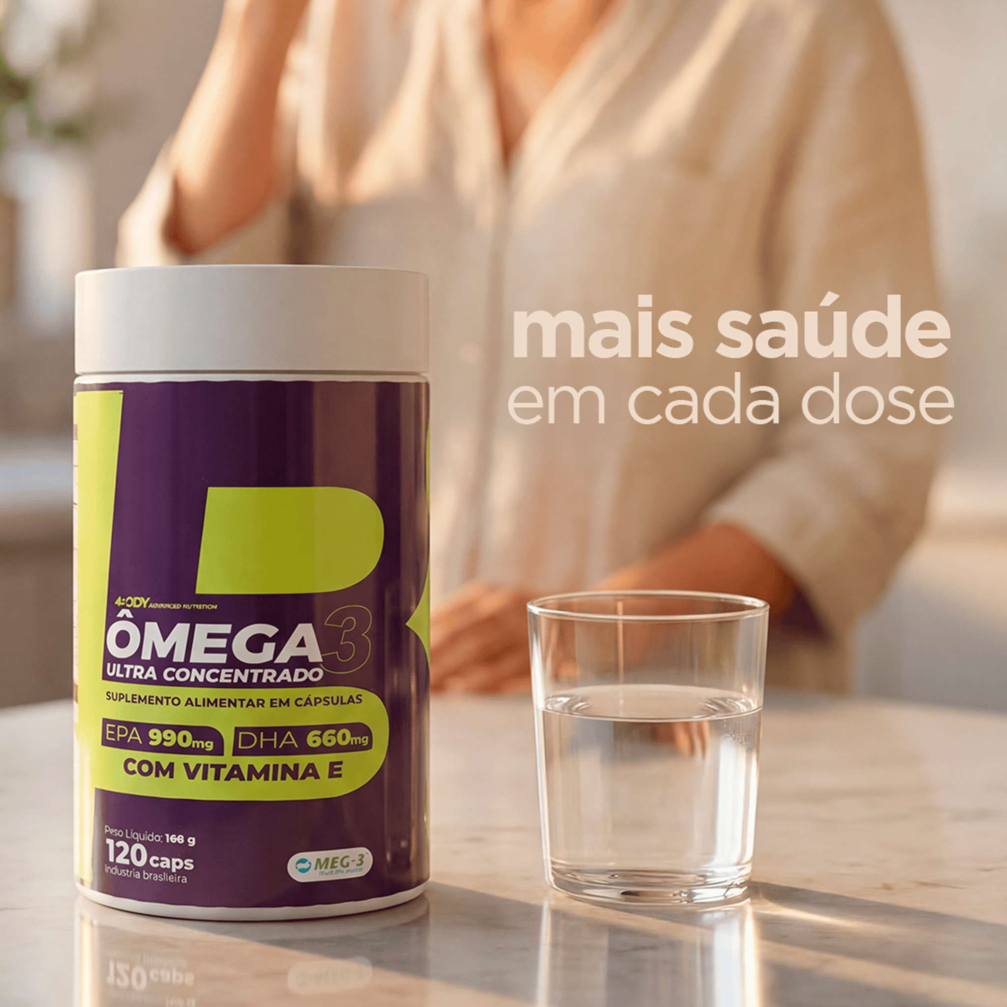 Ômega 3 Ultra Concentrado 4BODY foi feito para competir no topo da categoria: alta concentração real de EPA e DHA, matéria prima com selo MEG 3 e vitamina E na fórmula. Tudo isso em cápsulas práticas, pensado para quem leva suplementação a sério e quer um ômega 3 de alto padrão, comparável aos produtos premium do mercado.