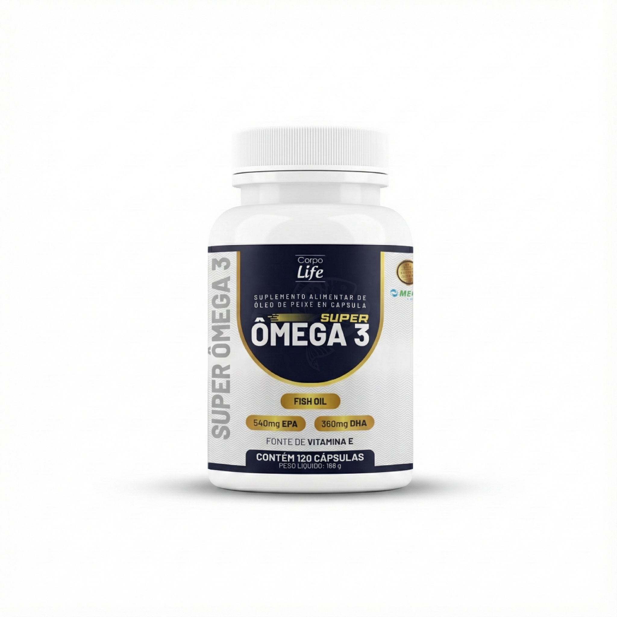 Super Ômega 3 Corpo Life com 540 mg de EPA e 360 mg de DHA por dose com Selo Meg3. Óleo de peixe concentrado com vitamina E para o dia a dia. Compre agora.