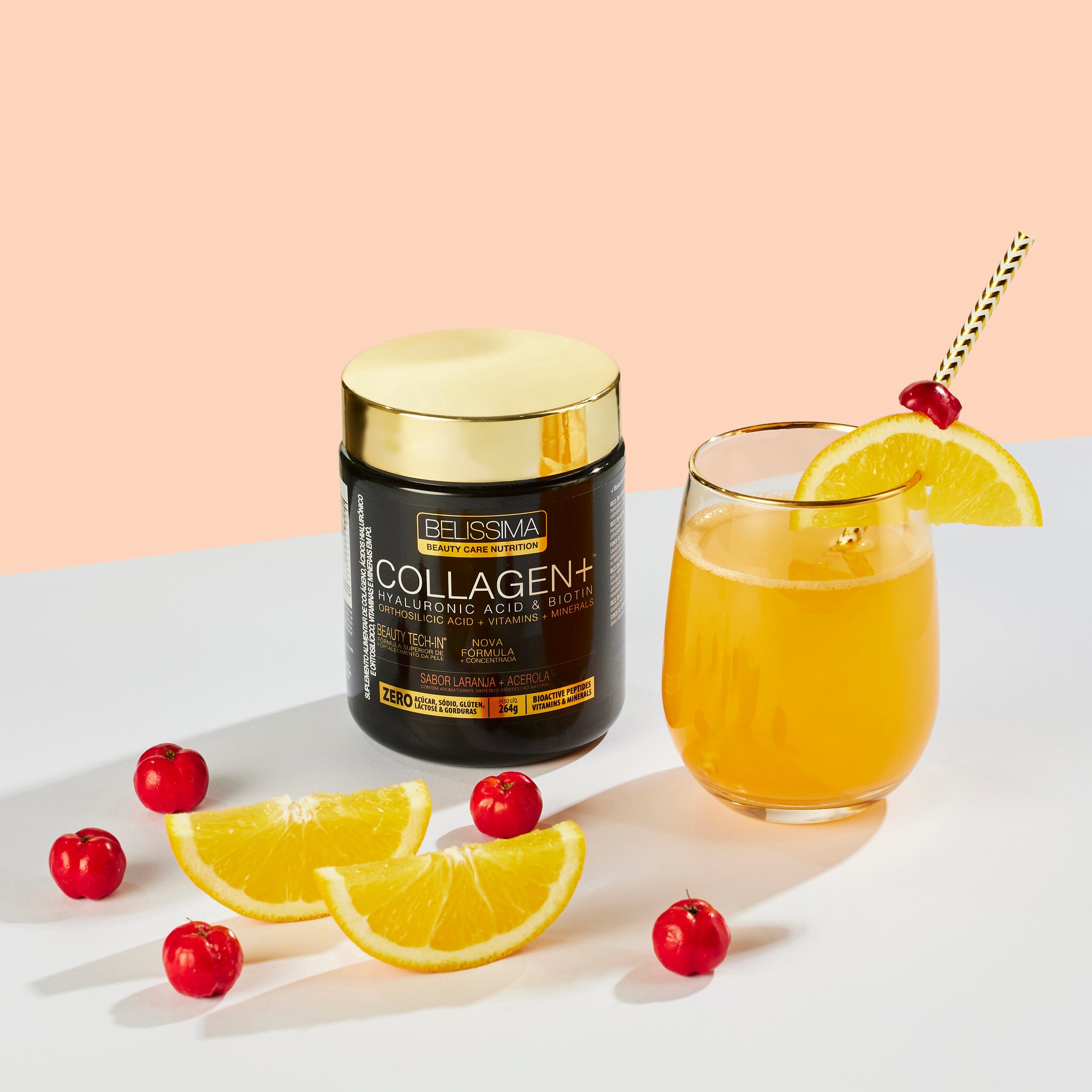 Laranja com acerola: Colágeno peptídico, peptídeos bioativos de colágeno hidrolisado com peso molecular médio de 2kDa (Verisol), polidextrose, mix de vitaminas (óxido de zinco, ácido ascórbico, acetato de D-alfa-tocoferol, selenometionina, D-biotina ), acerola em pó, hialuronato de sódio, ácido ortosilícico estabilizado em cloreto de colina, cloridrato de piridoxina, acidu- lante ácido cítrico, rosas gálicas, aromatizantes, antiumectante dióxido de silício, corante urucum e edulcorante glicosí- deos de esteviol.