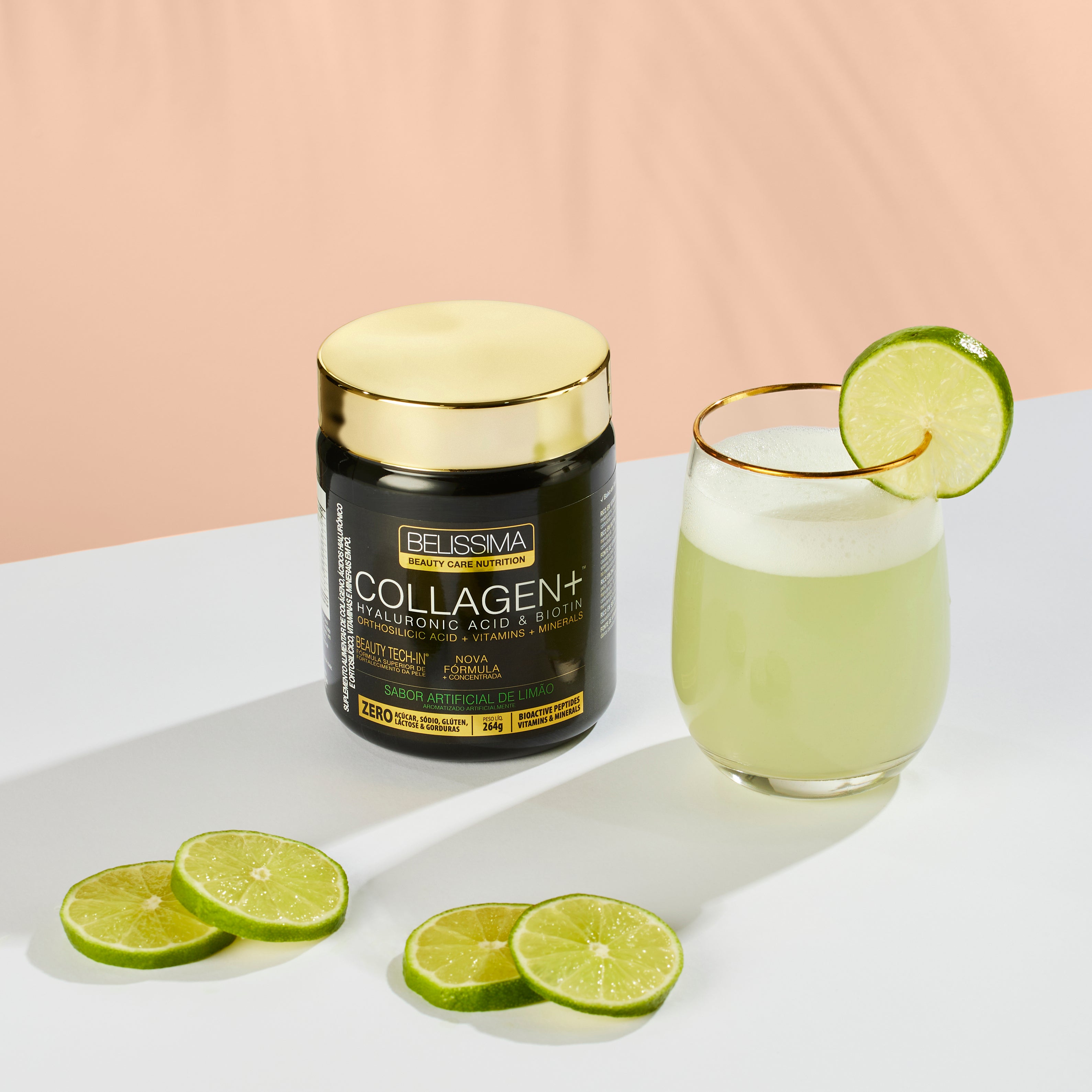 Limão: Colágeno peptídico, peptídeos bioativos de colágeno hidrolisado com peso molecular médio de 2kDa(Verisol), polidextrose, mix de vitaminas (óxido de zinco, ácido ascórbico, acetato de D-alfa-tocoferol, selenometionina, D-biotina), hialuronato, ácido ortosilícico estabilizado em cloreto de colina, cloridrato de piridoxina, rosas gálicas, acidulantes ácido cítrico e málico, aromatizantes, corante clorofilina, antiumectante dióxido de silício e edulcorante glicosídeos de esteviol.