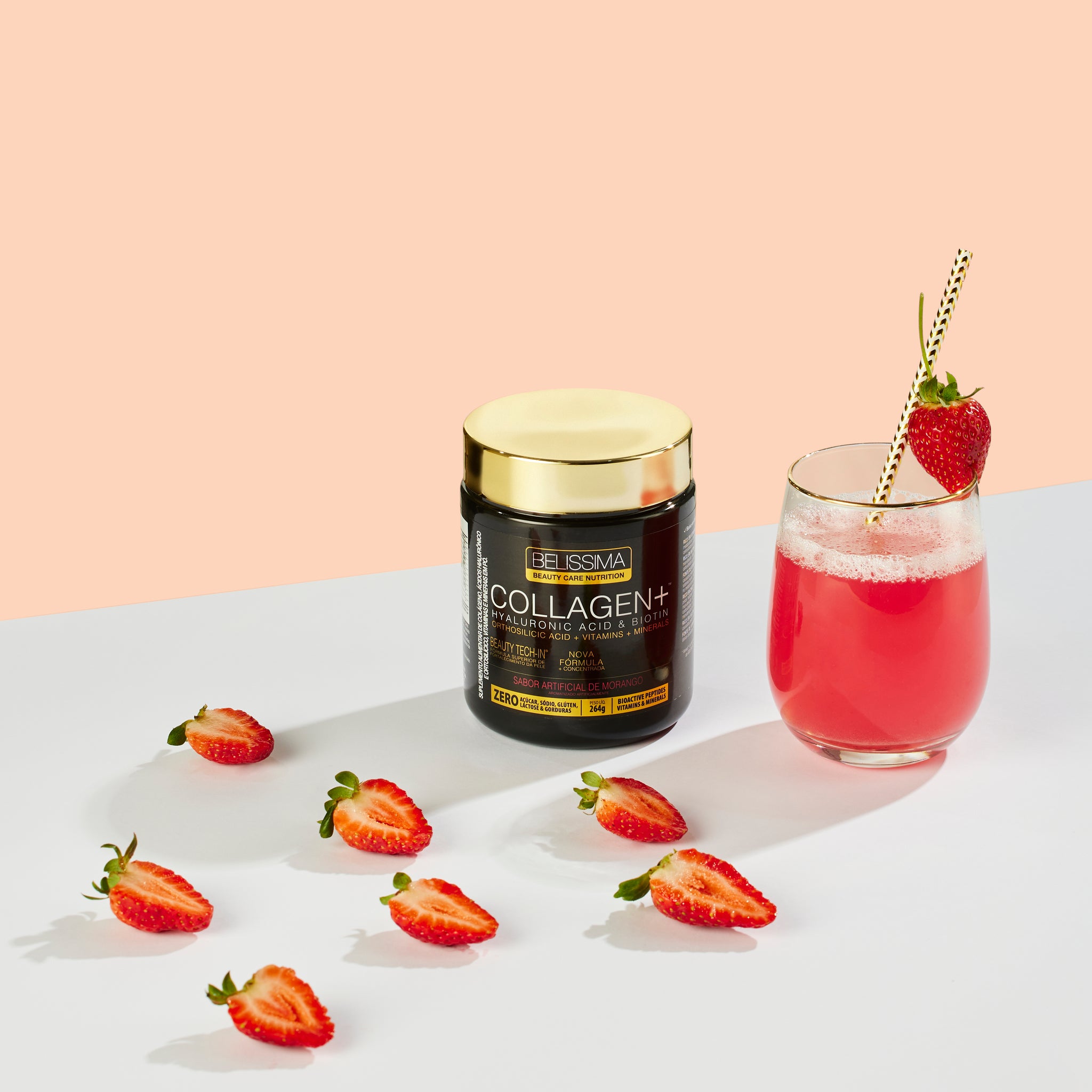 Morango: Colágeno peptítidico, peptídeos bioativos de colágeno hidrolisado com peso molecular médio de 2kDa (Verisol), polidextrose, mix de vitaminas (óxido de zinco, ácido ascórbico, acetato de D-alfa-tocoferol, selenometionina, D-biotina ), hialuronato de, ácido ortosilícico estabilizado em cloreto de colina, cloridrato de piridoxina, rosas gálicas, acidulante ácido málico, aromatizantes, corante vermelho de beterraba, antiumectante dióxido de silício e edulcorante glicosídeos de esteviol.