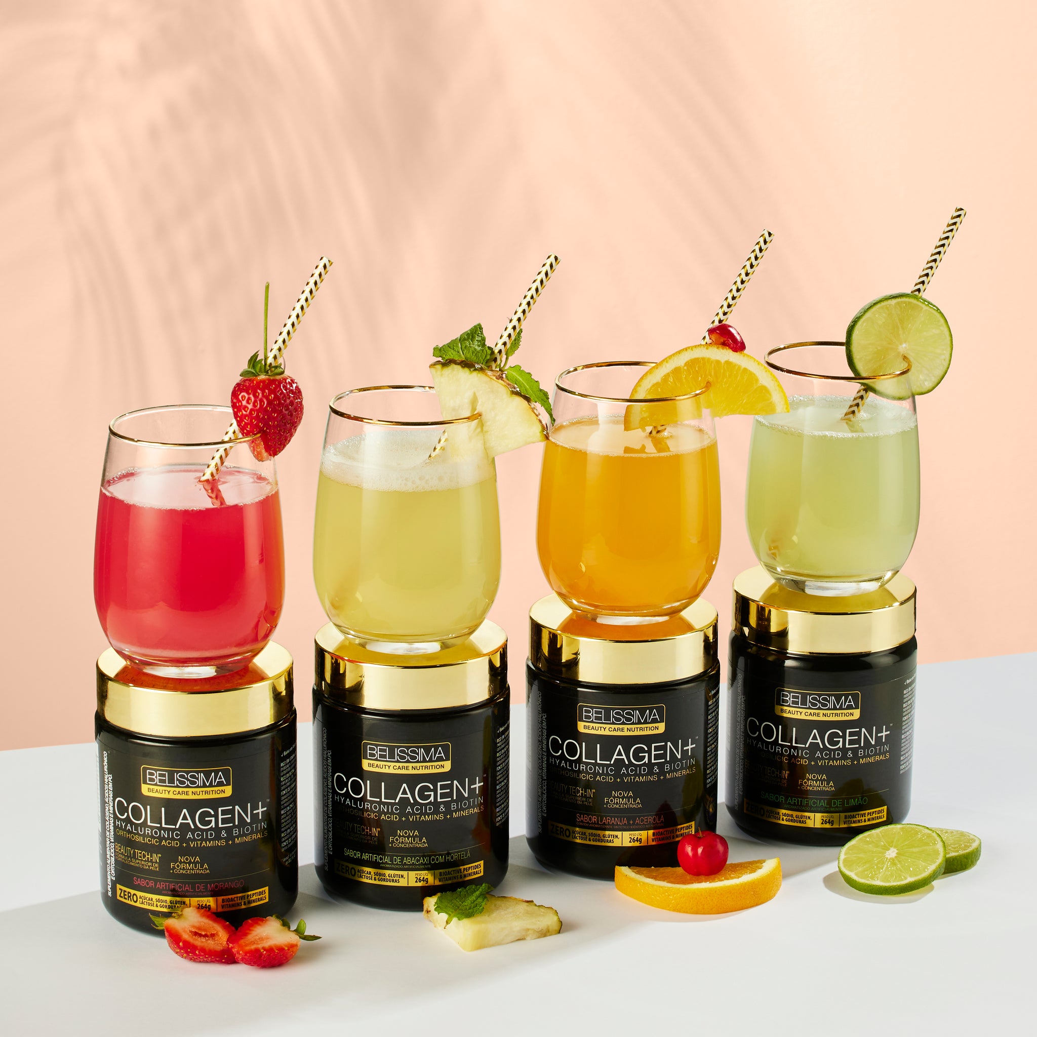 Abacaxi com hortelã: Colágeno peptídico, peptídeos bioativos de colágeno hidrolisado com peso molecular médio de 2kDa(Verisol), polidextrose, mix de vitaminas (óxido de zinco, ácido ascórbico, acetato de D-alfa-tocoferol, selenometionina, D-biotina), hialuronato, ácido ortosilícico estabilizado em cloreto de colina, cloridrato de piridoxina, rosas gálicas, acidulantes ácido cítrico e málico, aromatizantes, antiumectante dióxido de silício, edulcorante glicosídeos de esteviol, corante curcumina.