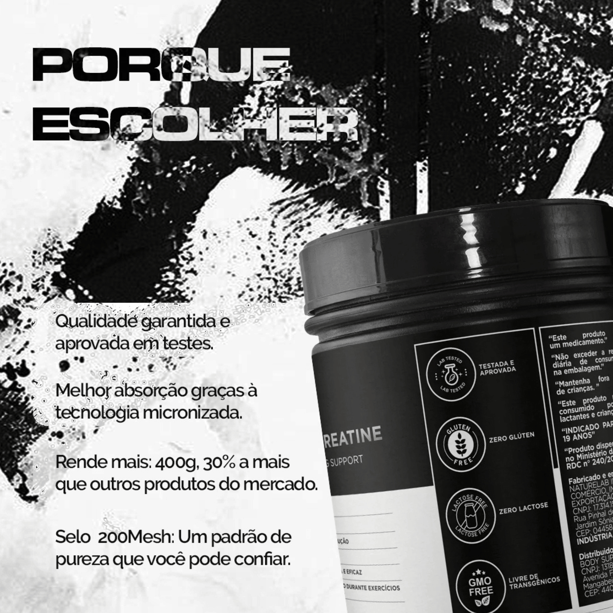 Com 100% de creatina monohidratada pura, este suplemento de alta performance é projetado para quem busca mais força, resistência e volume muscular. Sua fórmula micronizada e ultrafina (200 mesh) garante uma dissolução rápida e absorção eficiente, otimizando seus treinos e sua recuperação muscular.