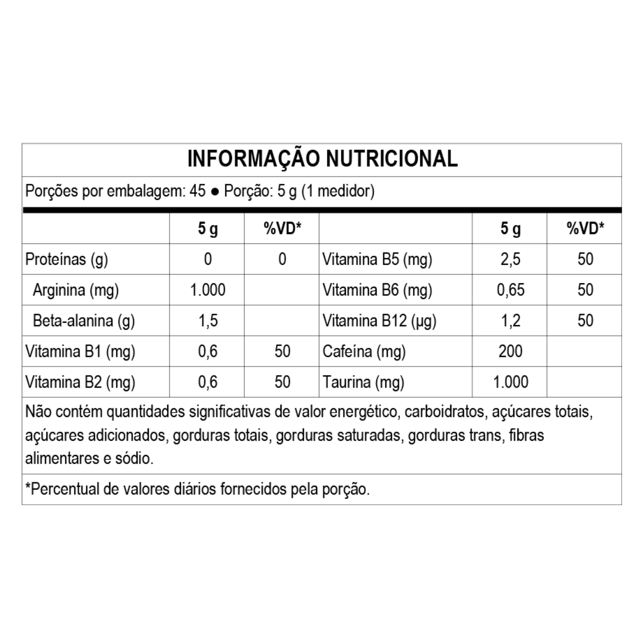 Contém cafeína (200 mg por porção). Não exceder a recomendação diária. Pessoas sensíveis à cafeína, gestantes, lactantes, crianças e pessoas com condições de saúde devem buscar orientação profissional antes do uso. Evite consumir próximo ao horário de dormir.